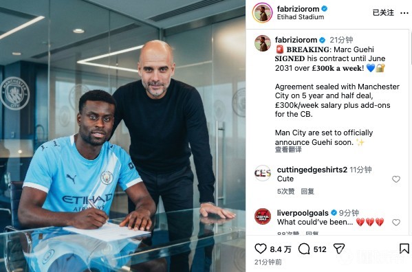罗马诺:格伊和曼城完成签约,合同5年半+周薪超过30万英镑