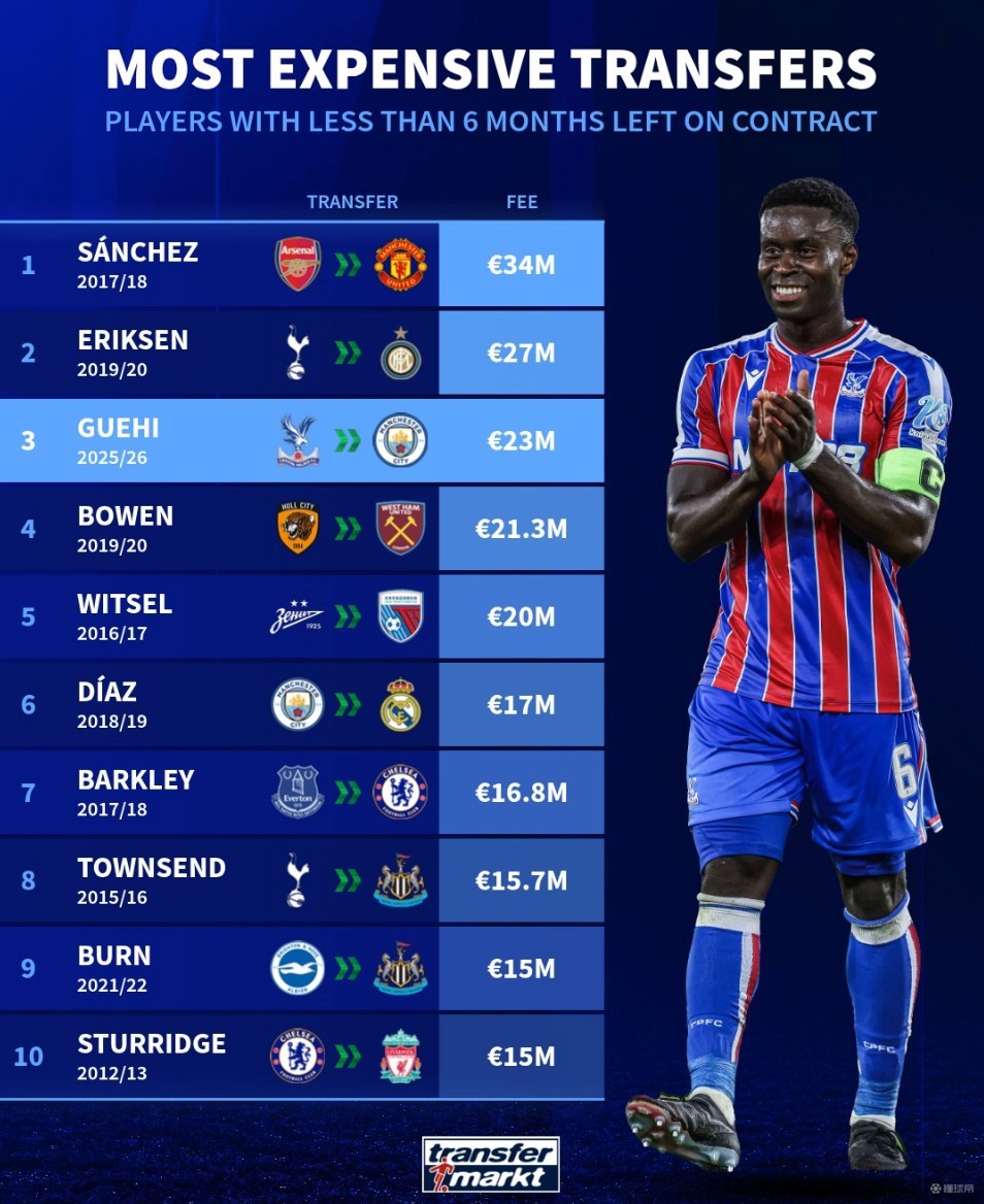 德转列合同剩半年球员转会身价榜:桑切斯3400万第1,格伊第3