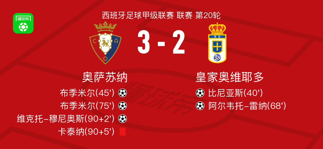 奥萨苏纳3-2逆转皇家奥维耶多,布季米尔梅开二度,维克托-穆尼奥斯建功